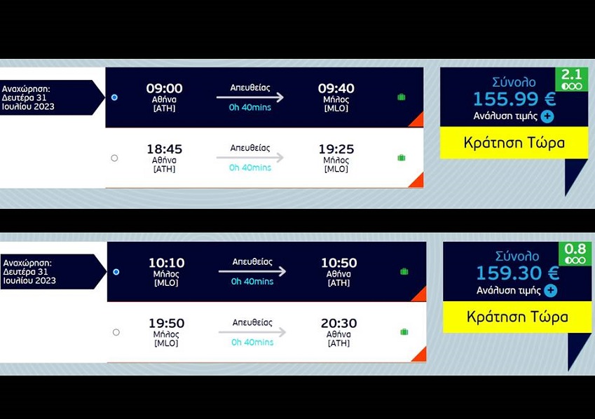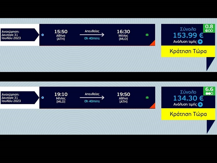 Συγκεκριμένα, αν θέλει κάποιος να ταξιδέψει αεροπορικώς από την Αθήνα στην Μήλο στις 31 Ιουλίου, θα πληρώσει το εισιτήριο 153,99 €, ενώ στην άλλη περίπτωση, από Μήλο προς Αθήνα θα πληρώσει 134,30 €, με τη μία αεροπορική εταιρεία, ενώ αν προτιμήσει την άλλη, τότε θα πληρώσει από Αθήνα για Μήλο 155,99 €, ενώ από Μήλο προς Αθήνα θα πληρώσει 159,30 €.