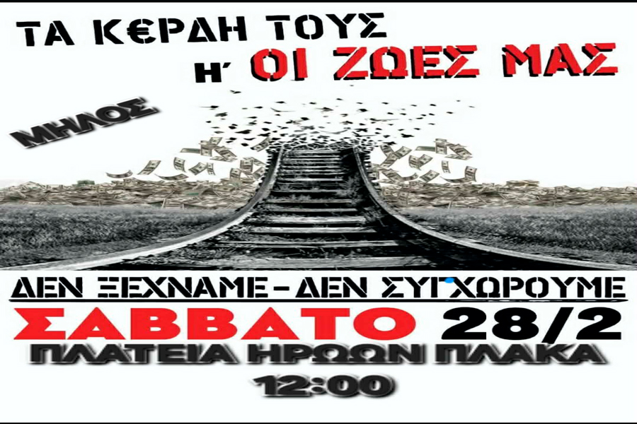 Η συγκέντρωση της Μήλου, θα γίνει το Σάββατο 28 Φεβρουαρίου στις 12:00 στην Πλατεία Ηρώων στην Πλάκα.