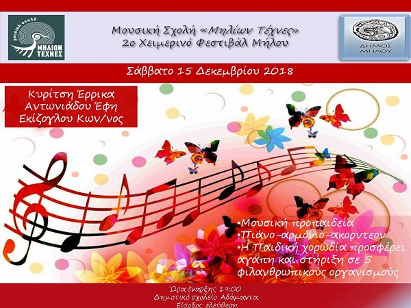 Η Μουσική σχολή Μήλου “Μηλίων Τέχνες” στο πλαίσιο του 2ου χειμερινού φεστιβάλ του Δήμου Μήλου διοργανώνει συναυλία το Σάββατο 15 Δεκεμβρίου στο Δημοτικό σχολείο Αδάμαντα. Ώρα έναρξης 19.00.