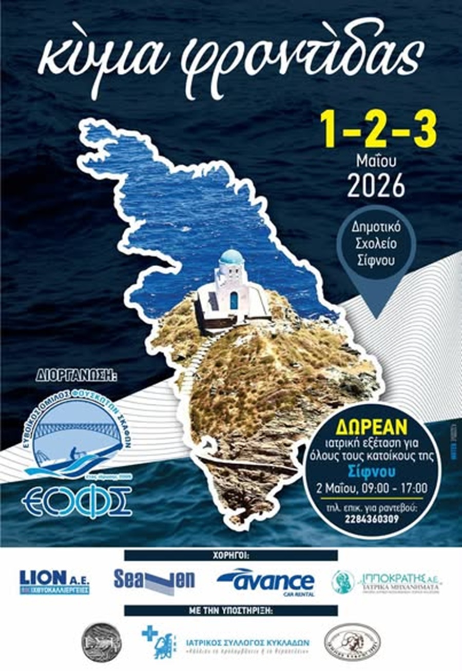 Στο πλαίσιο της επίσκεψης του Ευβοϊκού Ομίλου Φουσκωτών Σκαφών (ΕΟΦΣ) στο νησί της Σίφνου το τριήμερο 1 – 3/5/2026, κλιμάκιο ιατρών θα προσφέρει δωρεάν εξετάσεις στους κατοίκους της Σίφνου, το Σάββατο 2.5.2026 από τις 9 το πρωί ως τις 5 το απόγευμα, στο Δημοτικό Σχολείο της Σίφνου.