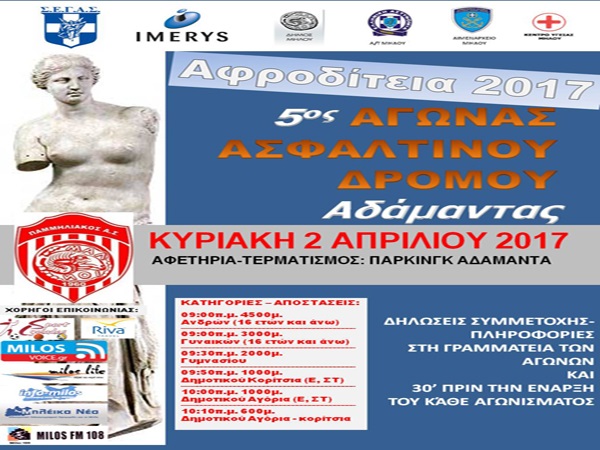Ο Παμμηλιακός διοργανώνει την Κυριακή 2 Απριλίου τον 5ο αγώνα ασφάλτινου δρόμου στον Αδάμαντα”Αφροδίτεια 2017″. Αφετηρία και τερματισμός το πάρκινγκ του Αδάμαντα.