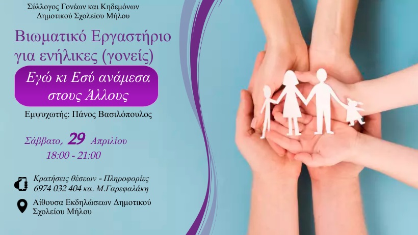 Ο Σύλλογος Γονέων και Κηδεμόνων Δημοτικού Σχολείου Μήλου διοργανώνει και σας προσκαλεί να συμμετέχετε στα θεατρικά εργαστήρια για γονείς παιδιών όλων των ηλικιών και ανεξαρτήτως σχολείου φοίτησης, καθώς και στα θεατρικά εργαστήρια για εκπαιδευτικούς Α/θμιας.