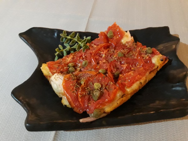 Σε μια λεκάνη η μπολ βάζουμε το αλεύρι με το αλάτι το δουλεύουμε λΊγο και προσθέτουμε τη μαγιά που έχουμε διαλύσει πριν σε λίγο χλιαρό νερό.Προσθέτουμε το ελαιόλαδο και δουλεύουμε για λίγη ώρα και κατόπιν προσθέτουμε το νερό και ζυμώνουμε μέχρις ότου έχουμε ένα ελαστικό ζυμάρι.Αφήνουμε το ζυμάρι να σταθεί για μισή ώρα το λιγότερο και κατόπιν το απλώνουμε σε καλά λαδωμένο ταψί,προσθέτουμε το κρεμμύδι , την ντομάτα και την κάπαρη(προαιρετικά) , τη ρίγανη (προαιρετικά),ραντίζουμε με ελαιόλαδο και ψήνουμε για 45′ σε μέτριο φούρνο (170°-180°).
