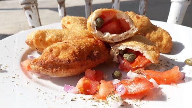 Ανοίγουμε το ζυμάρι σε ψιλά φύλα με ένα “ματσόξυλο” (πλάστη) και με τη βοήθεια ενός στρογγυλού σκεύους το κόβουμε σε στρογγυλά κομμάτια όπως κάνουμε με τα πιταράκια, βάζουμε λίγο υλικό από την γέμιση με την ντομάτα και το κρεμμύδι,στην οποία έχουμε προσθέσει το πιπέρι και τη ρίγανη,κλείνουμε ακριβώς όπως το πιταράκι σε μισοφέγγαρο και τηγανίζουμε σε καυτό ηλιέλαιο γυρνώντας τα συνεχώς με τη βοήθεια μιας λαβίδας ή πιρουνιού.