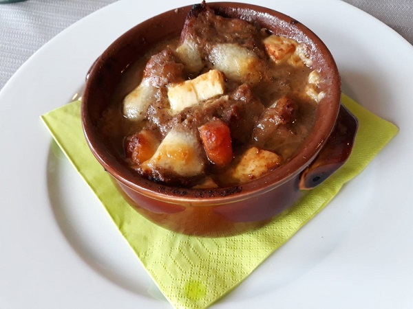 Σβήνουμε με το λευκό κρασί και προσθέτουμε το αλάτι, το πιπέρι και το μοσχοκάρυδο. Προσθέτουμε νερό μέχρι να καλυφθεί το κρέας και μαγειρεύουμε αφού σκεπάζουμε το σκεύος με καπάκι για περίπου 2 ώρες, προσέχοντας να υπάρχει υγρό μέσα στην κατσαρόλα για να μην καεί το κρέας. Αφού τελειώσει το μαγείρεμα μοιράζουμε το κρέας σε πυρίμαχα σκεύη η πήλινα προσθέτουμε κύβους και από τα δύο τυριά και ψήνουμε σε μέτριο φούρνο για 5 περίπου λεπτά.