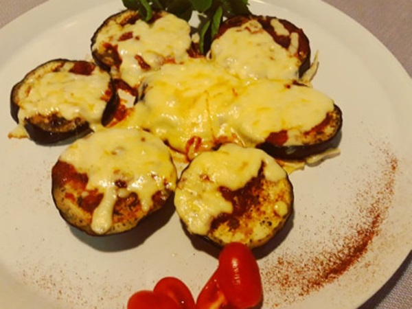 Ψήνουμε σε τοστιέρα για 1 λεπτό περίπου τις φέτες μελιτζάνας (εναλλακτικά στο γκριλ ή ακόμη καλύτερα σε κάρβουνα) τις τοποθετούμε σε ρηχό ταψάκι για πίτσα και τις καλύπτουμε με τη σάλτσα ντομάτας και τα υπόλοιπα υλικά που επιθυμούμε. Ψήνουμε σε μέτριο φούρνο για 5 περίπου λεπτά και σερβίρουμε αμέσως.