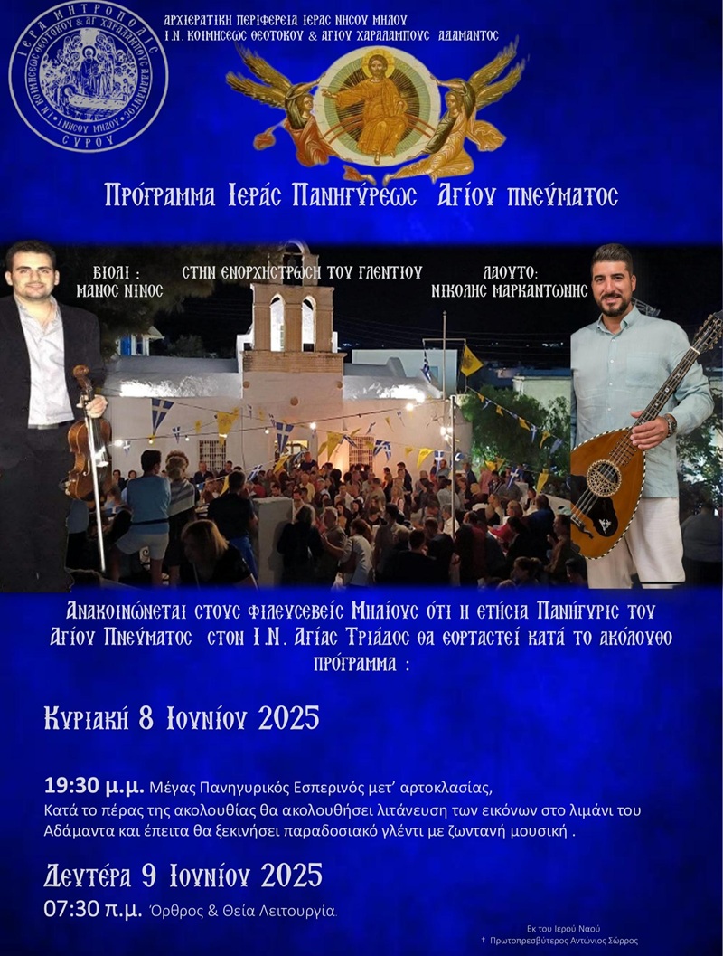 Γιορτάζει η Αγία Τριάδα στον Αδάμαντα. Ακολουθεί το πρόγραμμα του πανηγυρικού εορτασμού.
