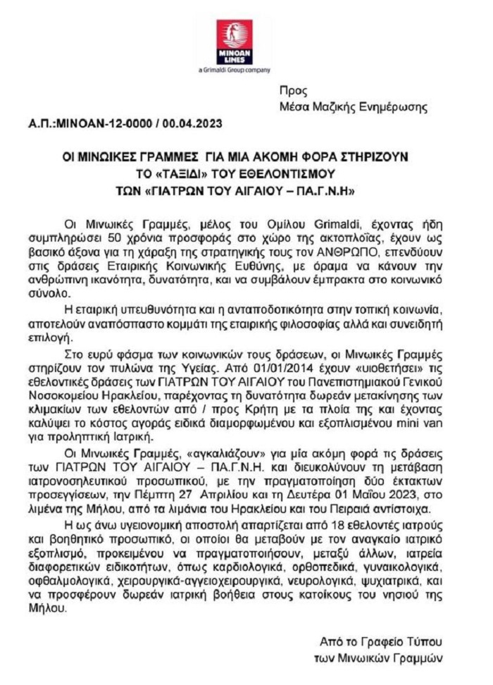 Τις Μινωικές Γραμμές ευχαριστεί ο Δήμος Μήλου: