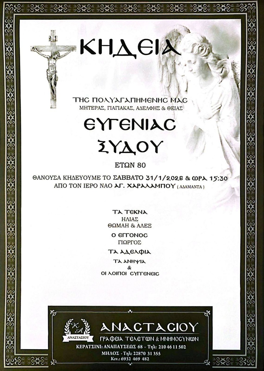 Η εξόδιος ακολουθία θα τελεστεί αύριο Σάββατο στον Ιερό Ναό Αγίου Χαραλάμπους Αδάμαντα ώρα 15.30